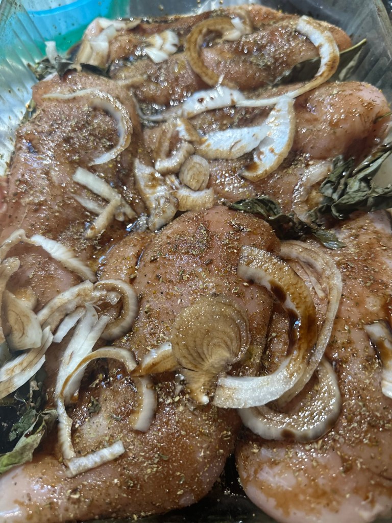 - Add Aromatics Scatter the sliced onion and minced garlic over the chicken. Drizzle balsamic vinegar across the top for a tangy kick.
