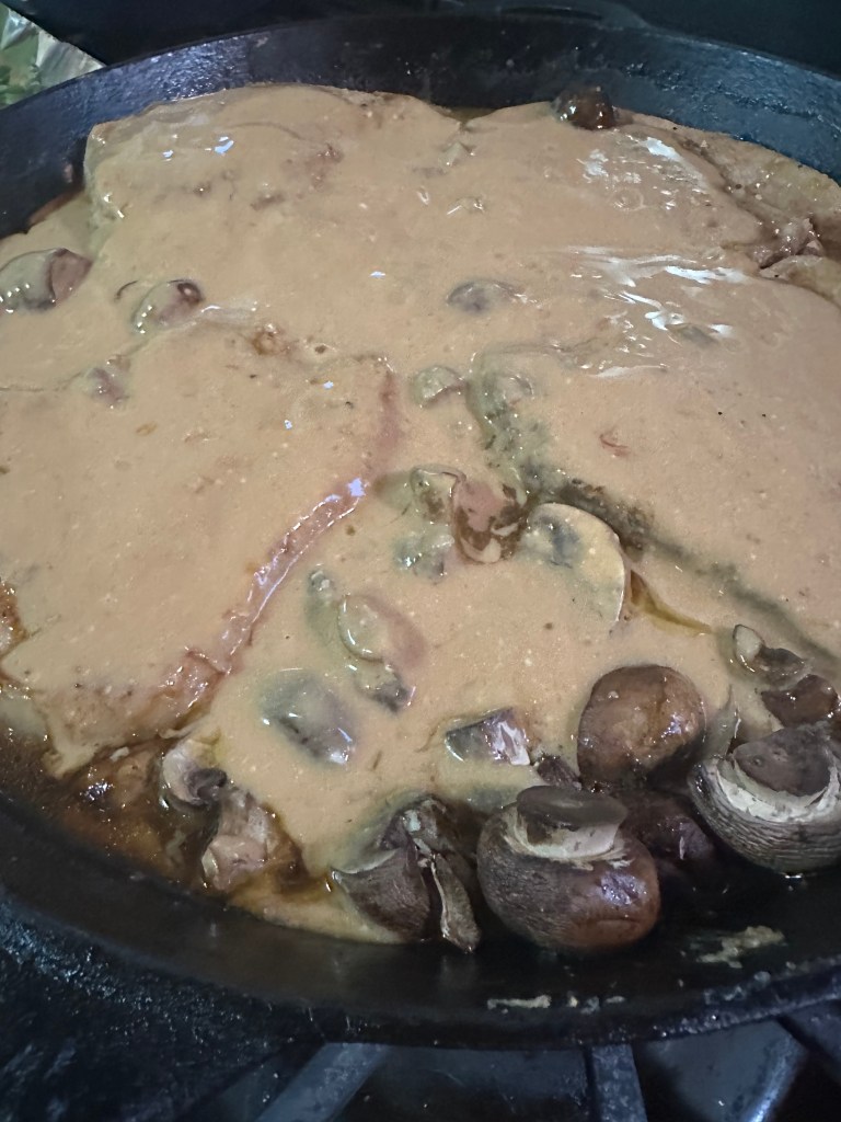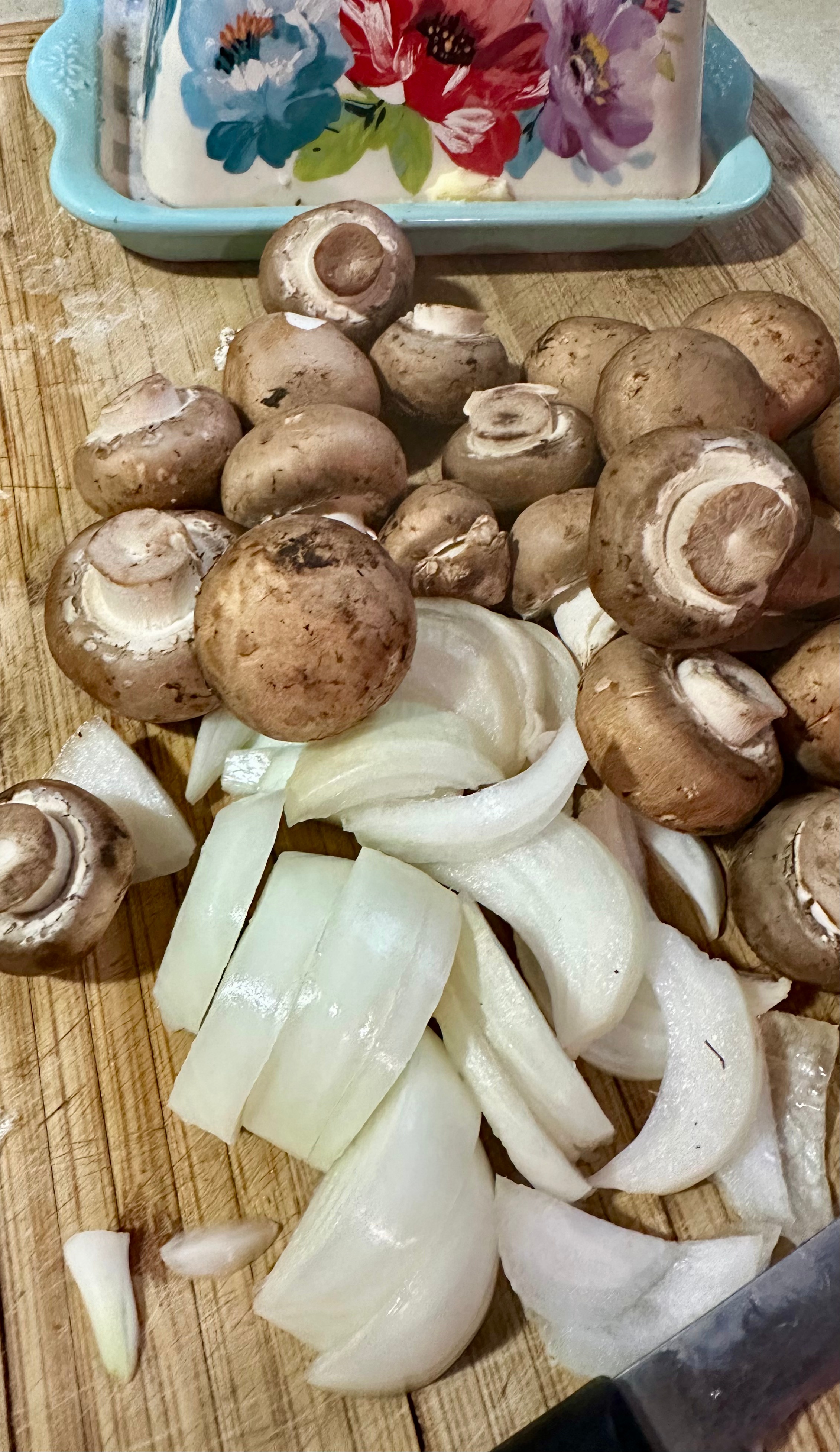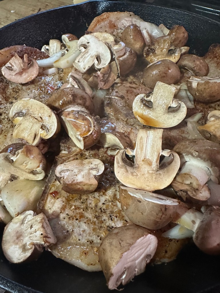 Top each pork chop with sliced onion and halved baby portabella mushrooms.