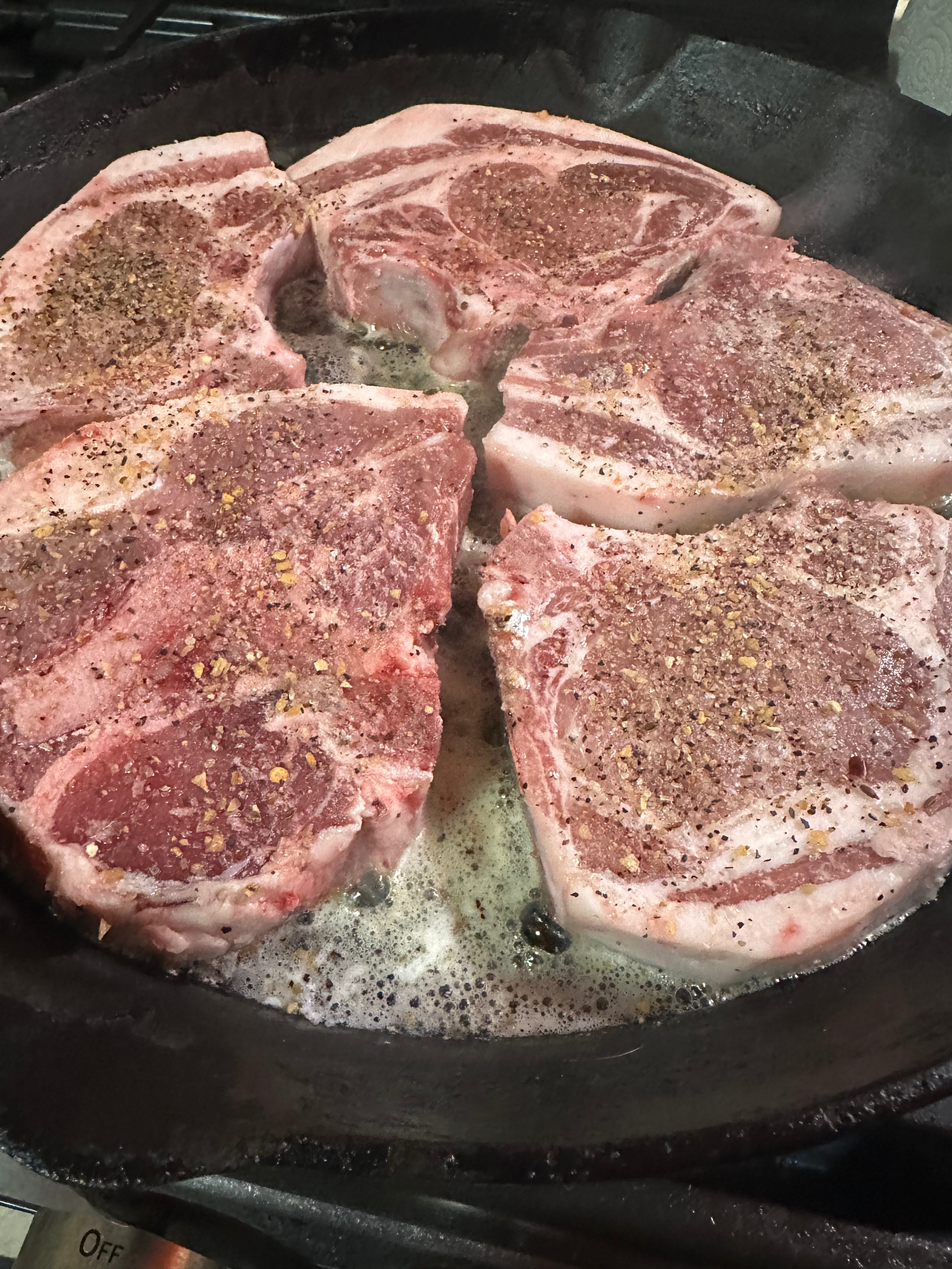 Season the pork chops generously with salt, pepper, and garlic. Sear each side in your skillet for about 4 minutes, until lightly browned.