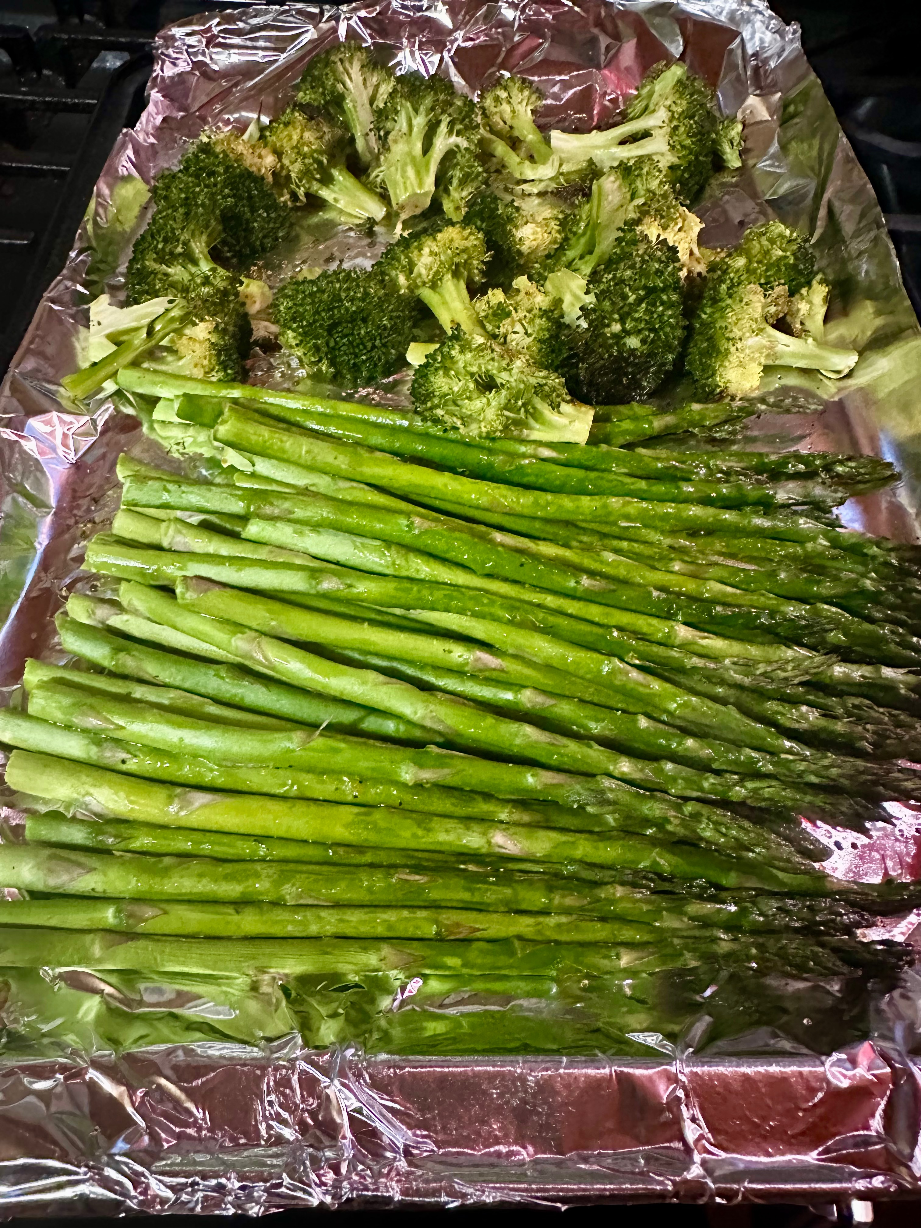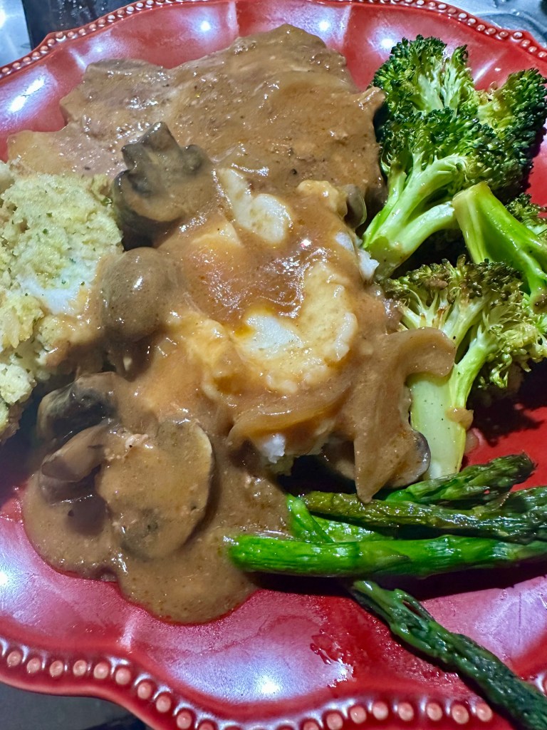 Smothered pork chops with mushroom gravy, mashed potatoes, stuffing, roasted asparagus and broccoli. The whole works.
