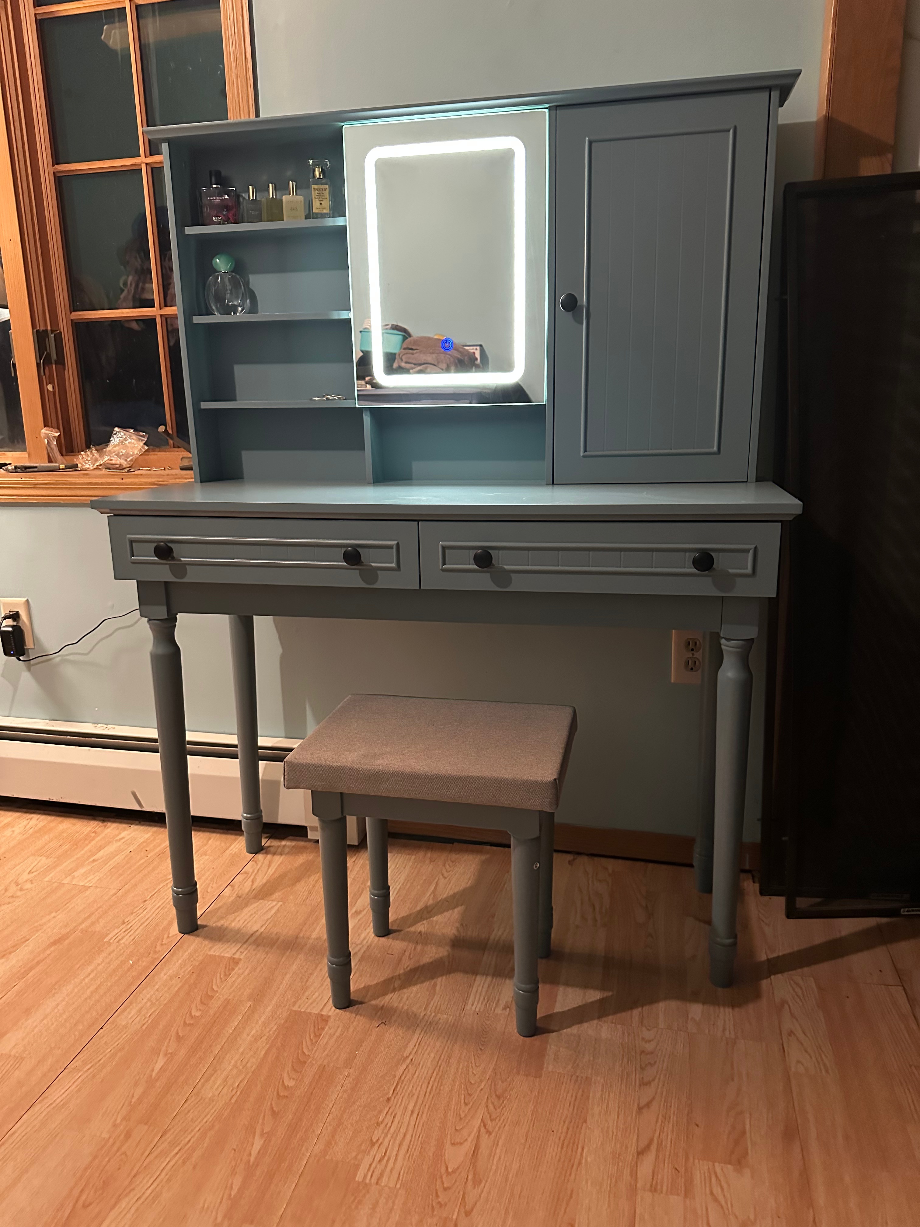 And yes — I now have the most beautiful new makeup vanity. The photo doesn’t do the color justice, it’s a beautiful blue. (you can see it here 👉 https://creatorlink.shop/4aN3GP6). It may have had a million parts, but watching him patiently put it together for me? That’s the real luxury. #ad #Wayfair #WayfairCreator and @wayfair